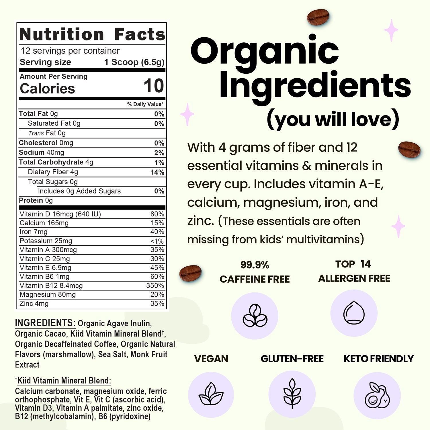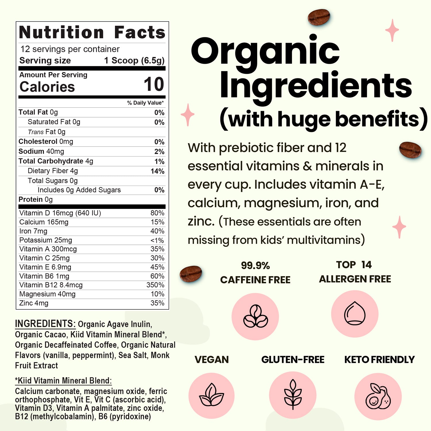 With one serving of Kiid Coffee, our kids now get at least one antioxidant-rich superfood: organic, decaffeinated coffee and/or raw cacao, as well as a healthy dose of prebiotic fiber (inulin), and an essential vitamin and mineral blend that includes calcium, magnesium, iron, and vitamins A through E. If mixed with dairy milk, every cup of Kiid Coffee contains at least 6g of protein and another huge boost of calcium!