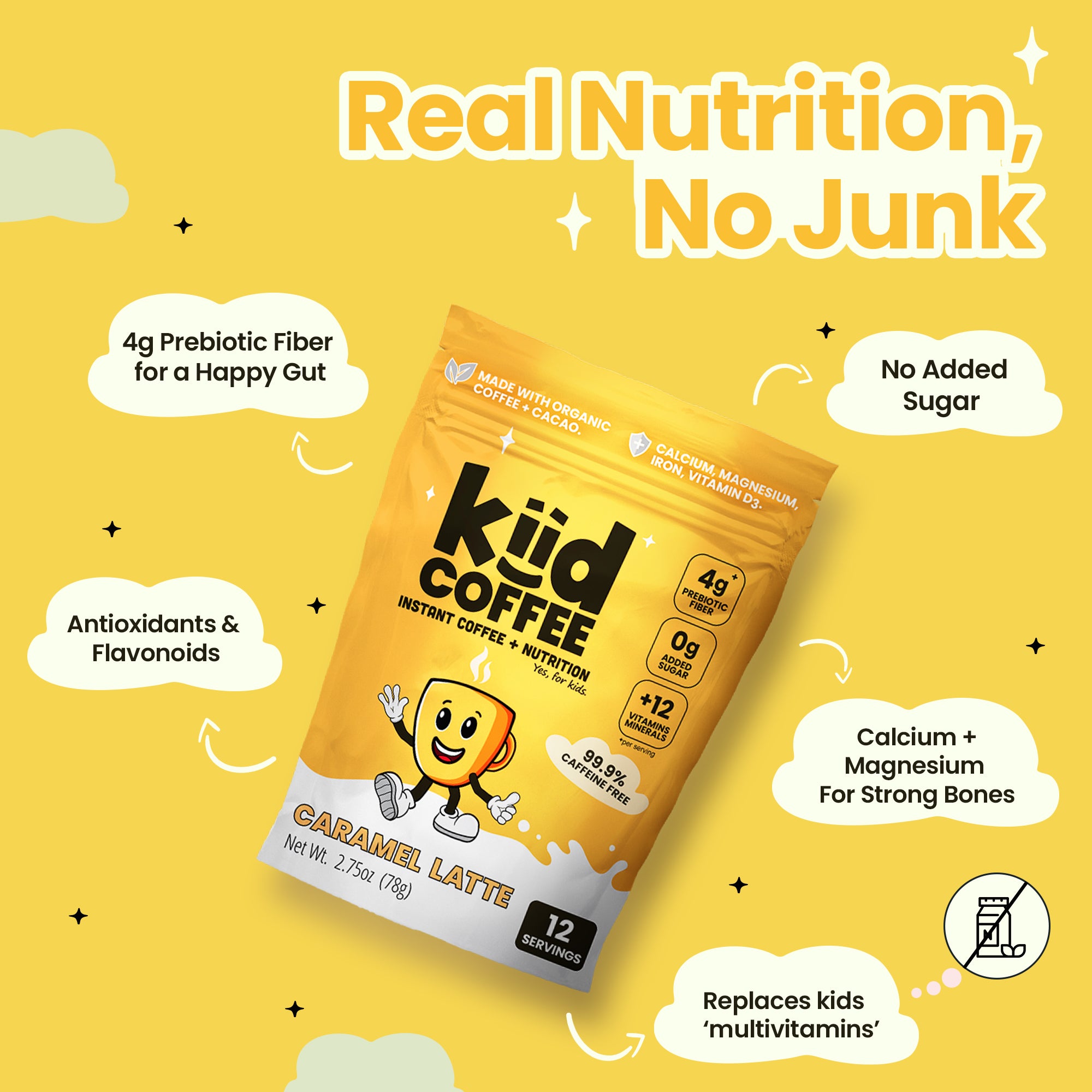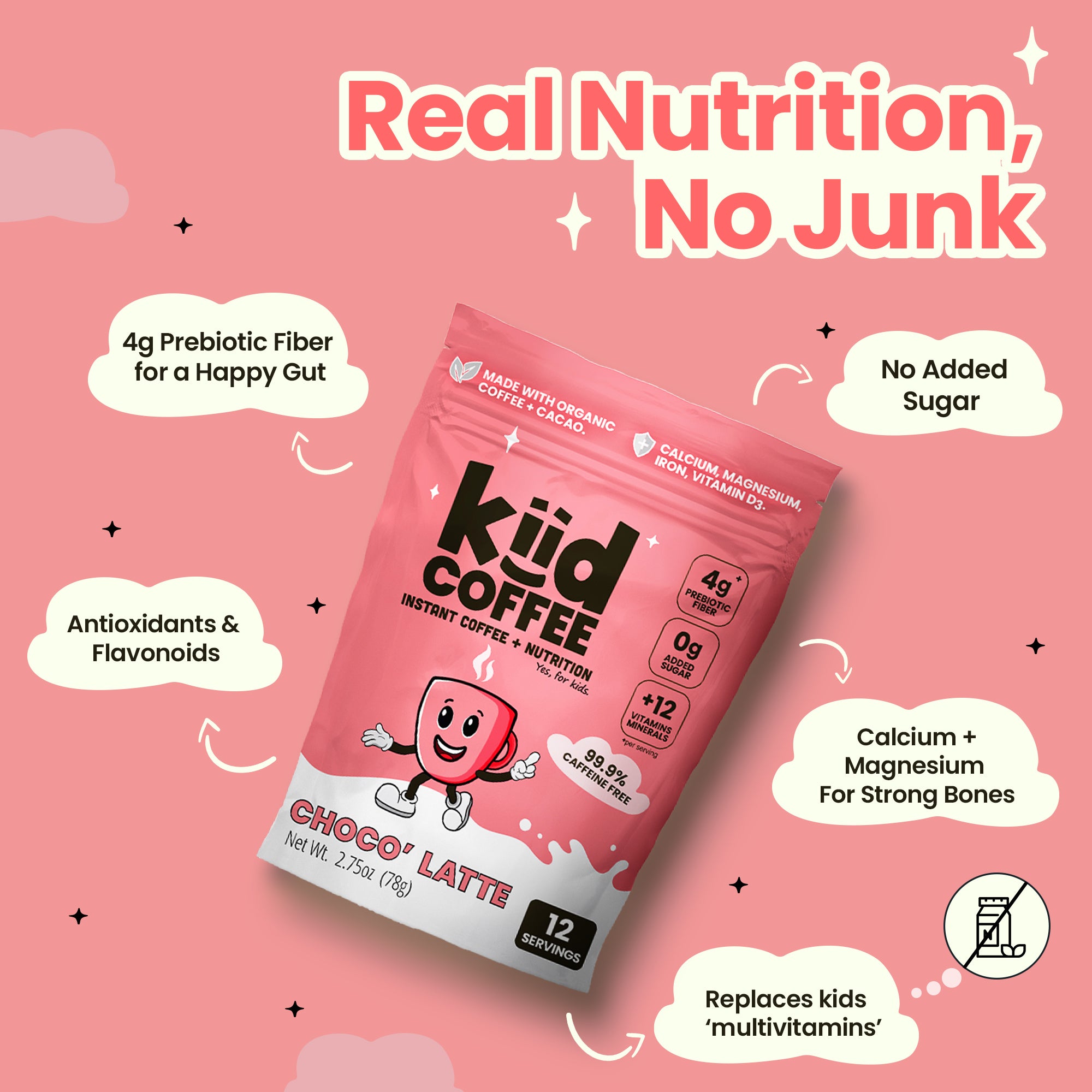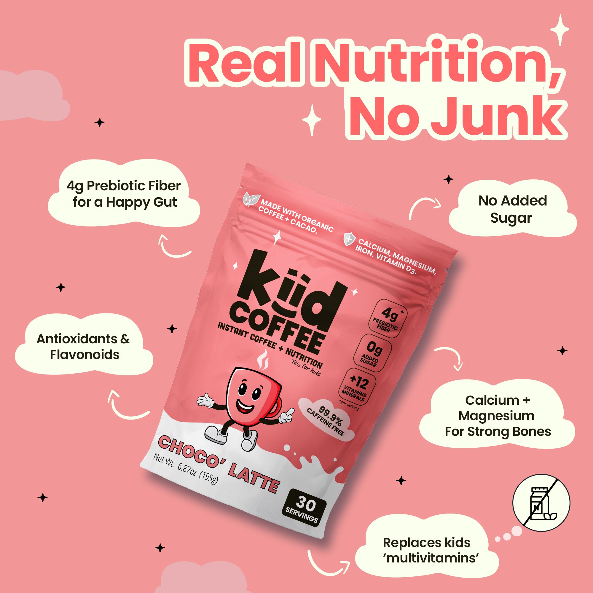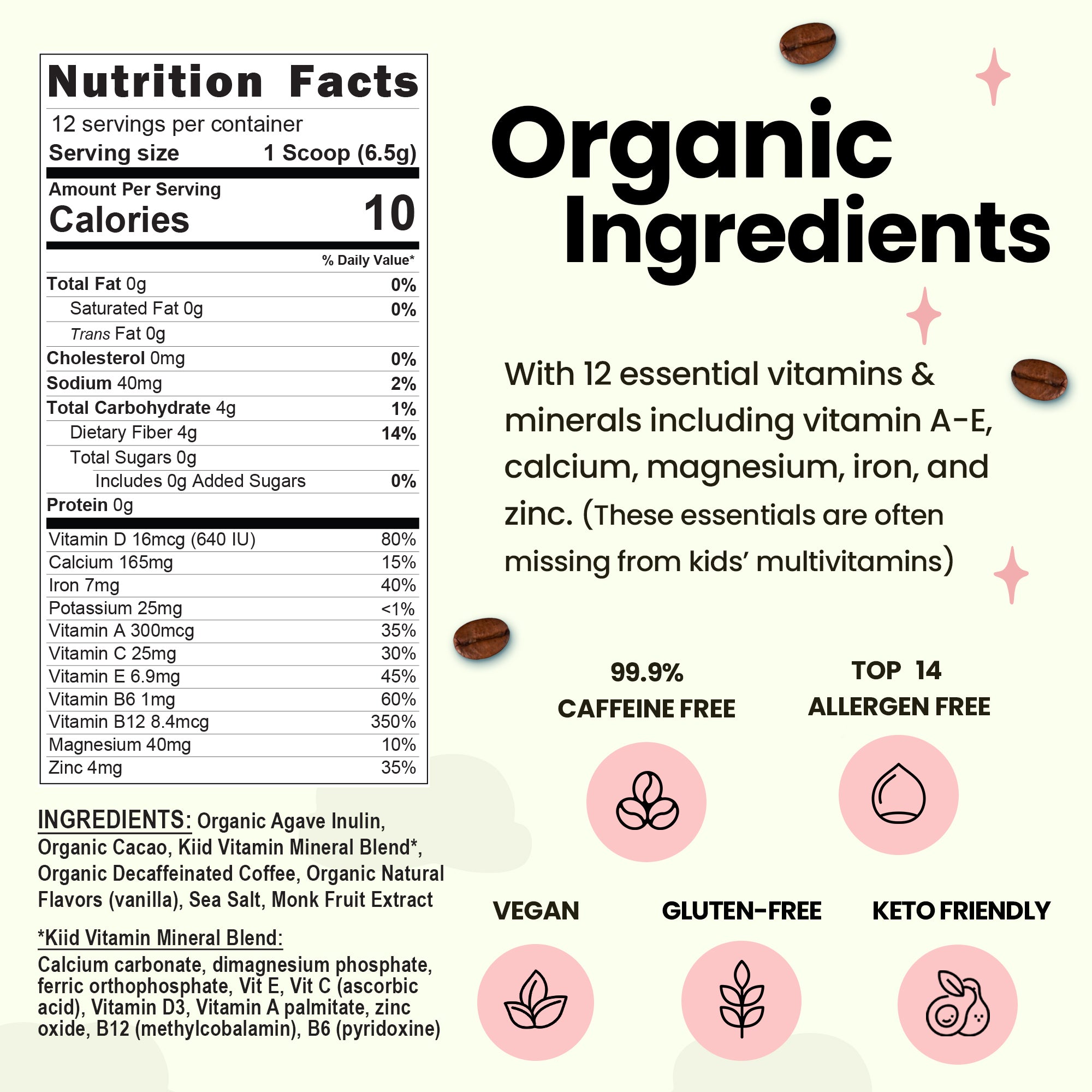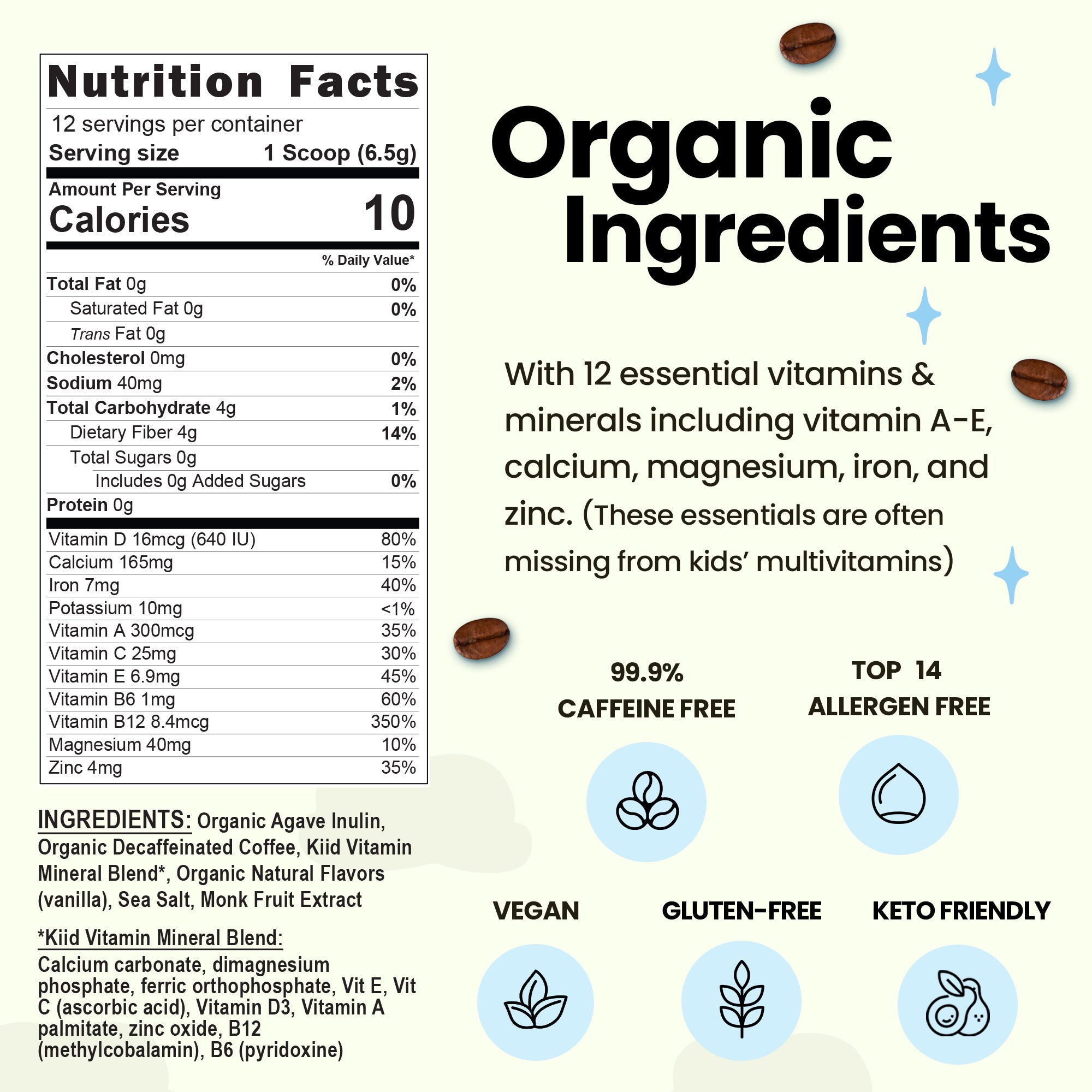 With one serving of Kiid Coffee, our kids now get at least one antioxidant-rich superfood: organic, decaffeinated coffee and/or raw cacao, as well as a healthy dose of prebiotic fiber (inulin), and an essential vitamin and mineral blend that includes calcium, magnesium, iron, and vitamins A through E. If mixed with dairy milk, every cup of Kiid Coffee contains at least 6g of protein and another huge boost of calcium!
