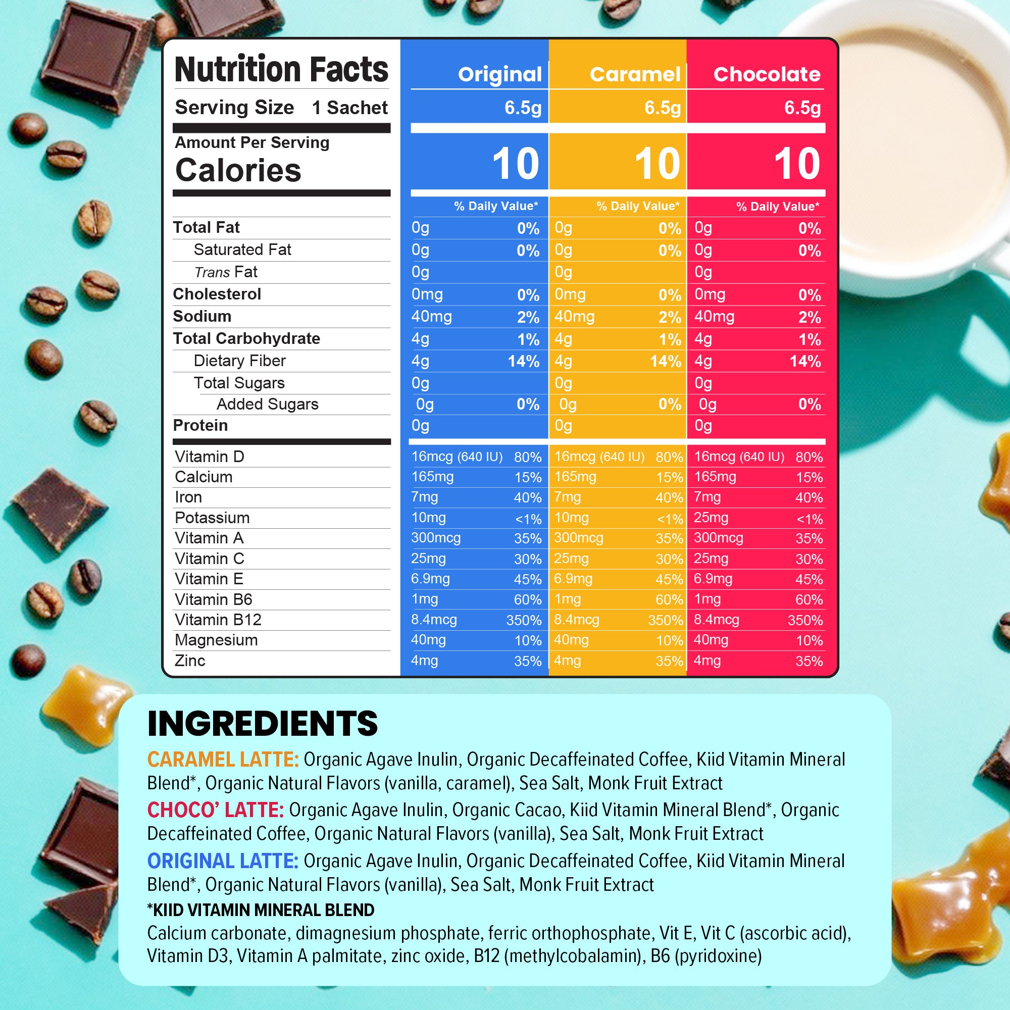 Kiid Coffee (1 serving): Original <1 mg, Caramel <1 mg, Choco'Latte ~4.2mg (due to the cocoa)